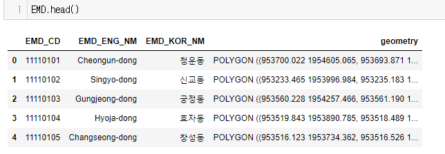 이렇게 가져온 EMD는 geopandas.geodataframe.GeoDataFrame 형태로 가져와집니다.